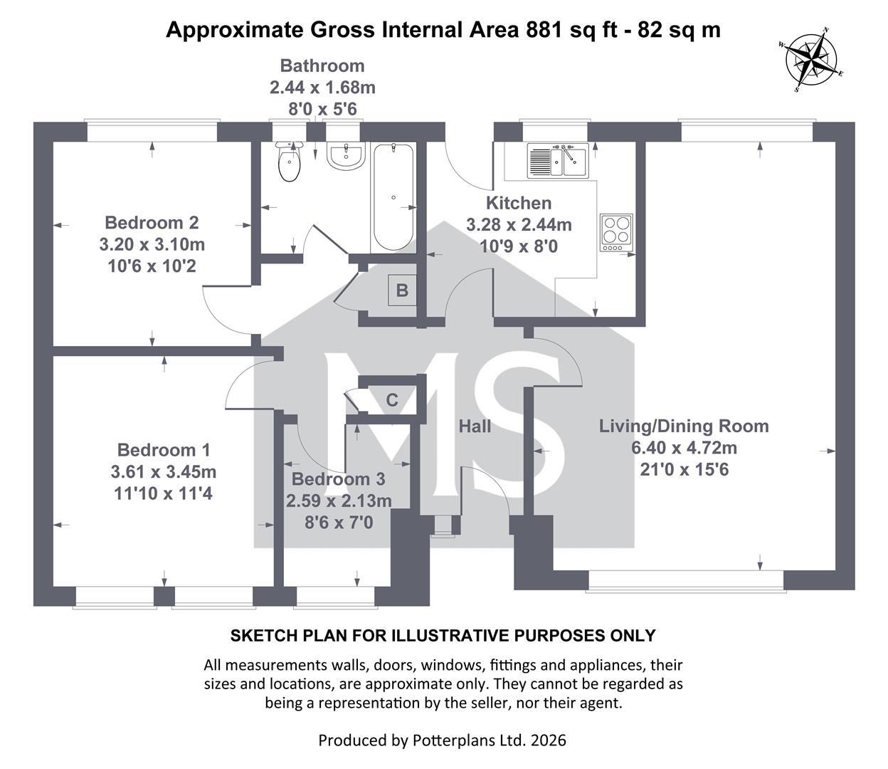 - Generous overall sapce, 881 sq ft internally